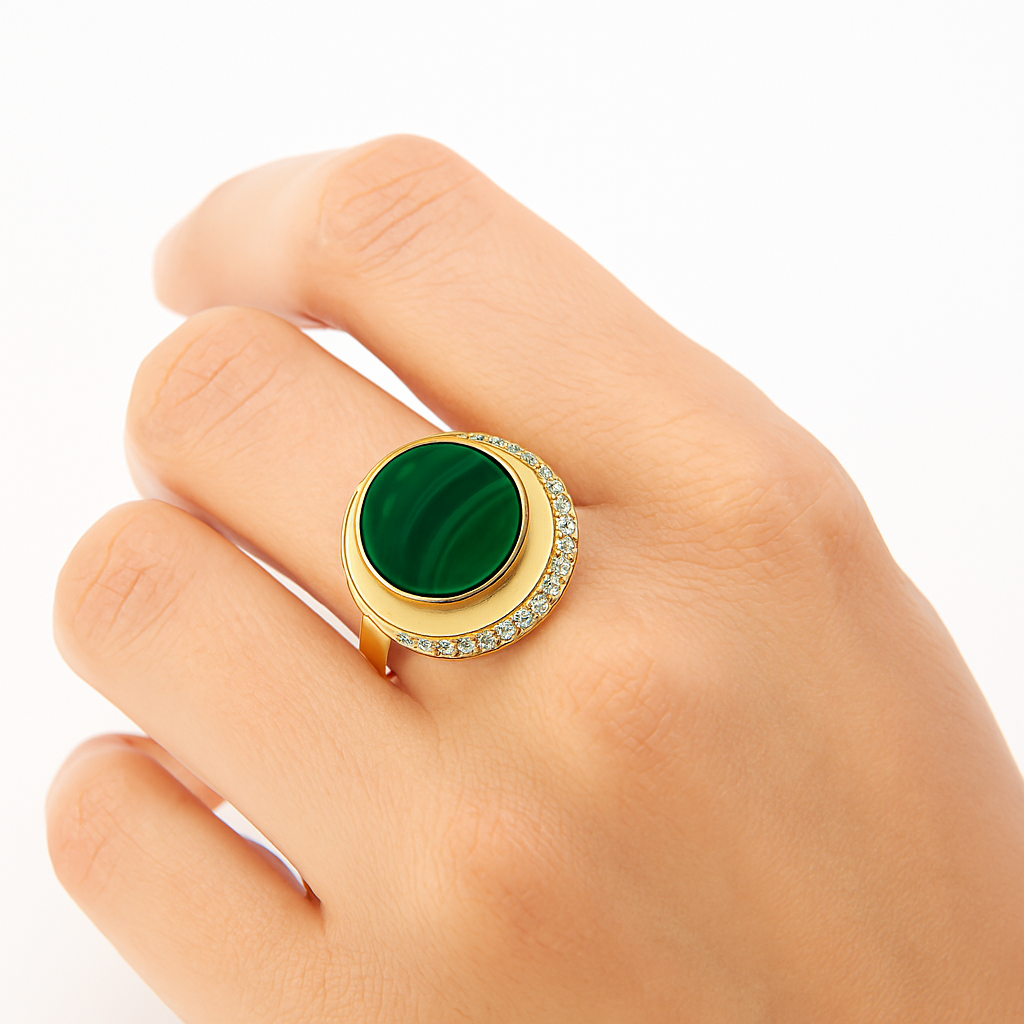 Anel em prata com pedra verde circular, de design sofisticado e acabamento polido, ideal para dar um toque de elegância a qualquer look.