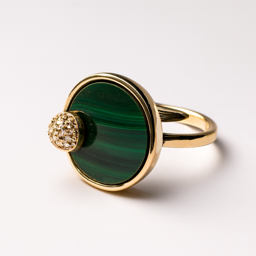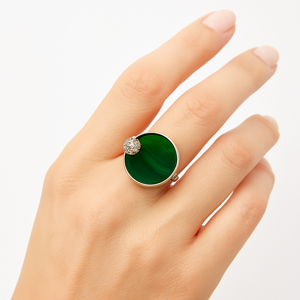 Anel em prata com grande pedra verde circular e detalhe superior em zircónias, combinando elegância moderna com um toque sofisticado de cor.