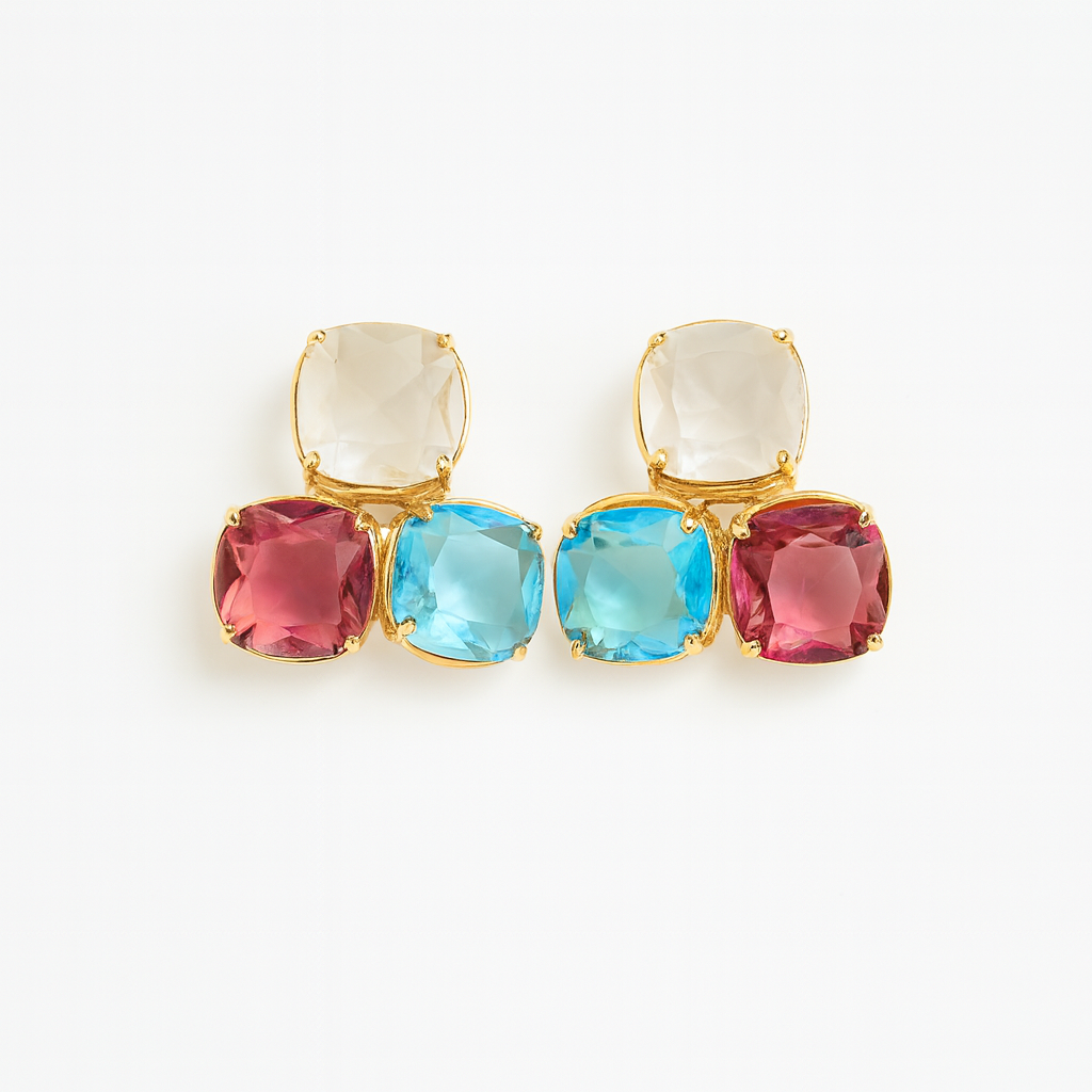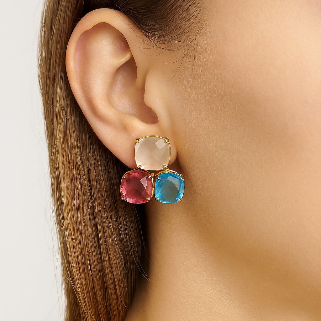 Brinco delicado e sofisticado, confeccionado em prata, com design geométrico composto por três pedras de formato quadrado e lapidação suave. As gemas apresentam cores harmoniosas — um tom claro e translúcido na parte superior, acompanhado por uma pedra rosa e outra azul na parte inferior — criando um visual moderno e equilibrado. A estrutura em prata valoriza as cores das pedras e confere brilho sutil à peça, tornando-a ideal tanto para uso diário quanto para ocasiões especiais.